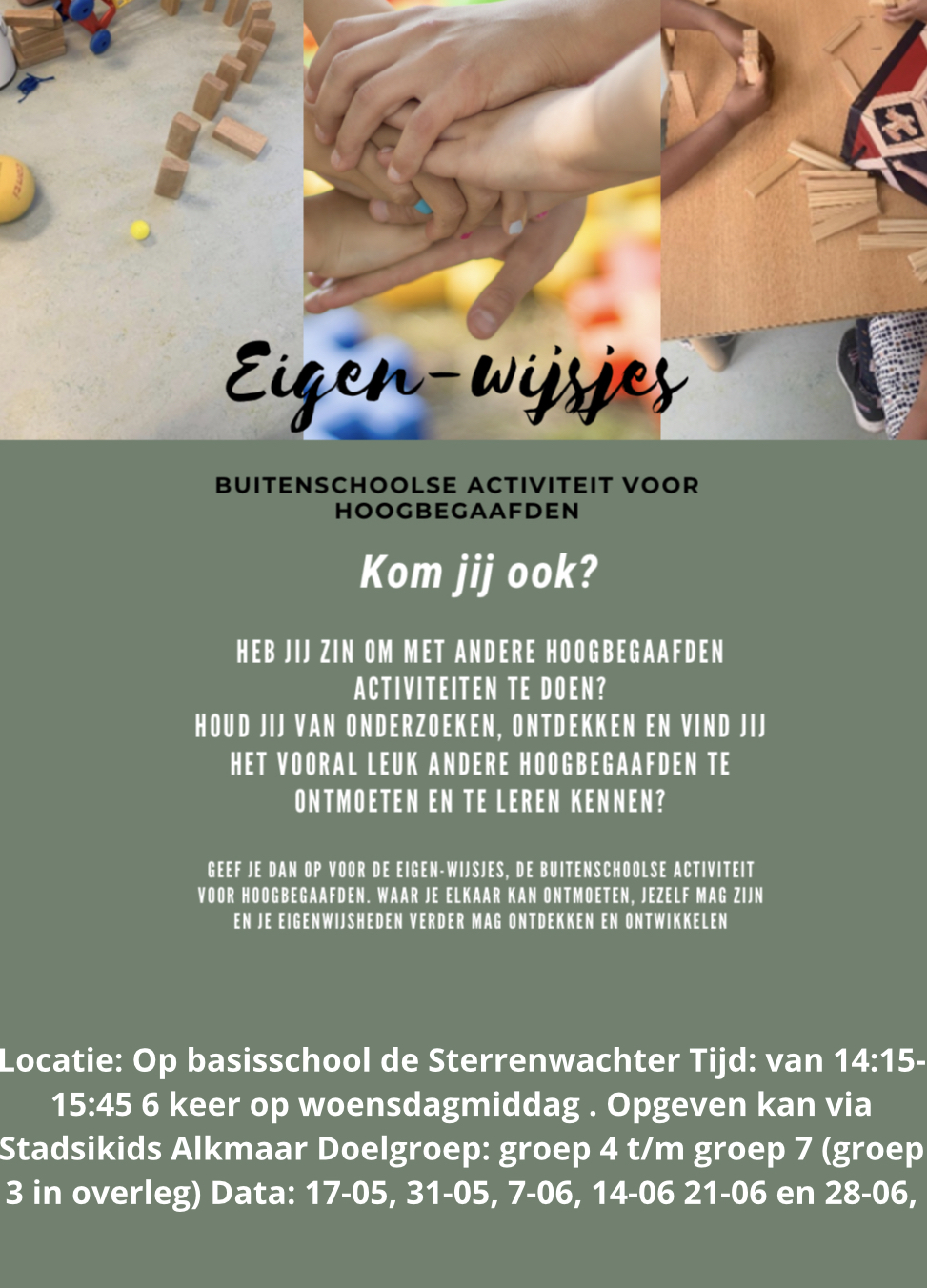 Ouders kunnen zich hiervoor opgeven via Stadskids Alkmaar: https://stadskidsalkmaar.nl