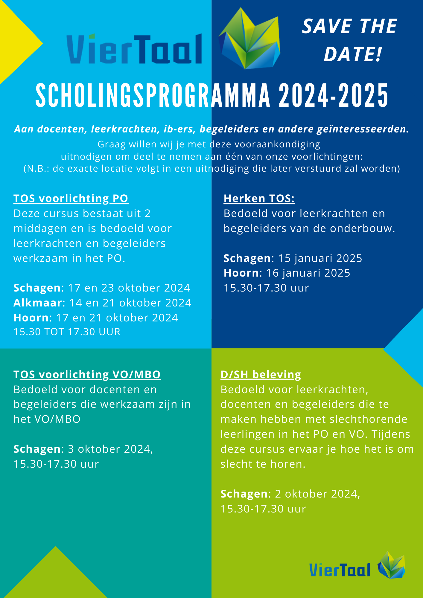 Zie bijlage voor de digitale versie van de flyer van VierTaal met daarin het scholingsprogramma voor alle leerkrachten, IB-ers en assistenten op scholen waar zij komen. VierTaal nodigt leerkrachten van harte uit om deze voorlichtingen bij te wonen om zo een stukje expertise en kennis op te doen voor hun leerlingen met cluster 2 onderwijsbehoeften.