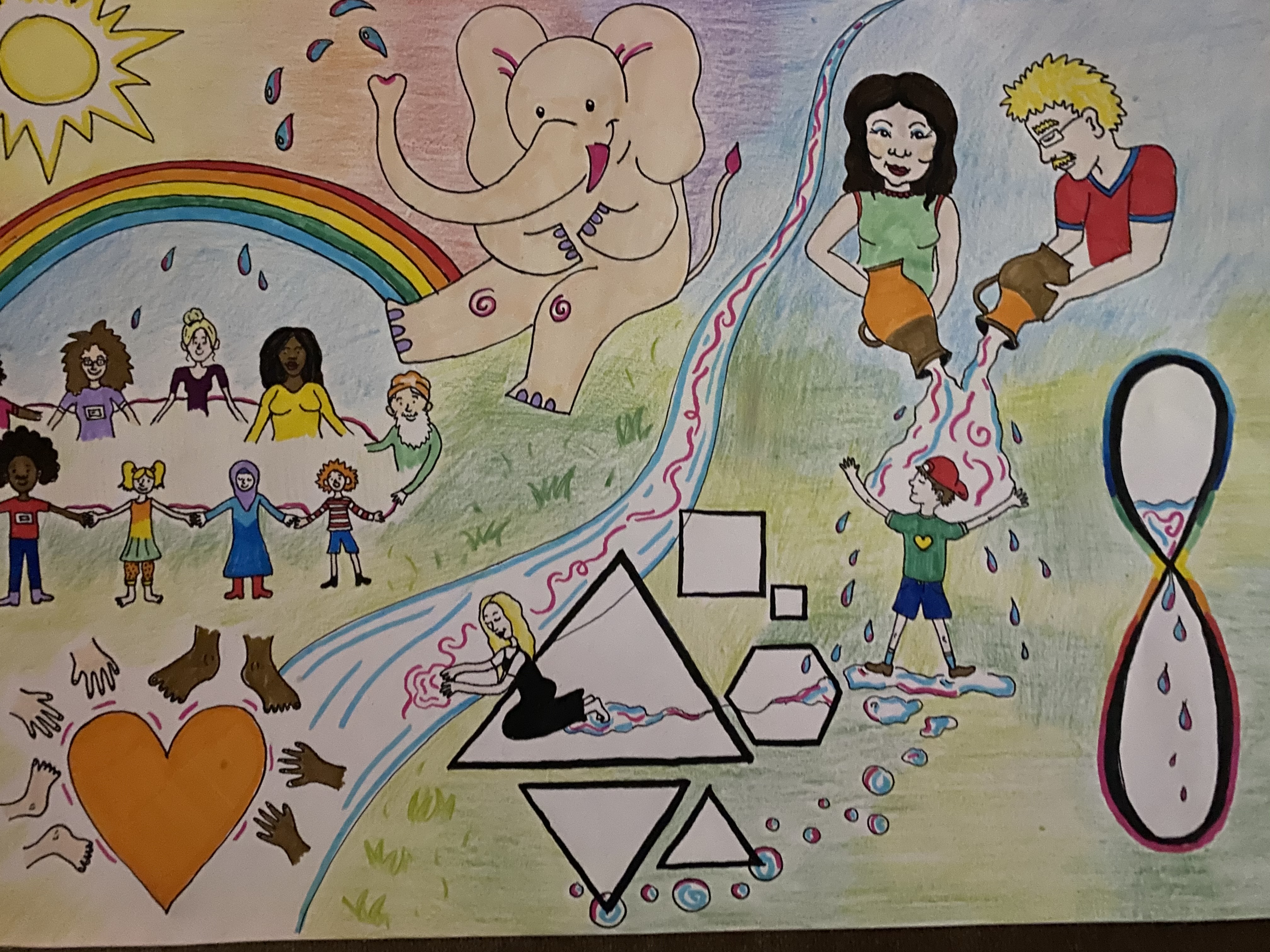 een visioning oefening van Club Dynamiek leverde beschreven beelden op die passen bij het best denkbare passende onderwijs. Mijn dochter Dewi heb ik gevraagd daar een tekening van te maken.